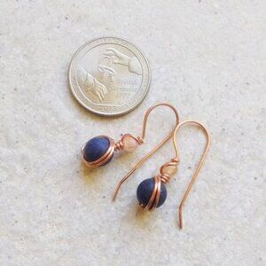 Unique dark blue, matte Lapis Lazuli + honey colored Agate Beads. Wire Wrapped with bright copper jewelry wire, with a long elegantly shaped + hammered earwire. A bit over an inch in length. I only made one pair of these - if you like this color combo - come and get it today!