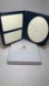 Elegant and timeless WAKO Ginza Tokyo photo frame album crafted in textured black leather with gold-tone metal corner protectors. Features two rectangular photo windows and one oval window, with “WAKO” branding in the oval insert. Comes in original presentation box with Japanese care instructions, tissue wrap, and outer sleeve.