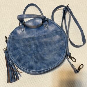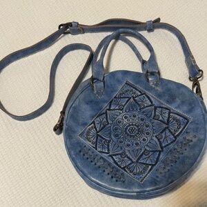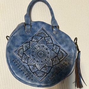 Blue Hand Made One at a Time Handbag by "Leaders in Leather" Round 51" Diameter, 9-1/4", Depth 2-1/2". HandTooled Front, 2 Handles. Shoulder or Cross Body Detachable 46" to 51" Strap. Detachable Tassle. 2 Zippered pockets + Cell Phone Pockets inside. Outside Pocket in back of Bag. Pictures of Details Handle, Hooks, Pockets, Hooks, Strap on + Off. 100% Leather from Paraguay, Vegetable Dyed, Pattern inside.