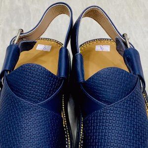 These traditional Peshawari chappals have been popular in Pakistan for years and are now gaining worldwide attention. Also known as Kheri chappal, Zalmi Peshawari chappal, Charsadda chappal, and Peshawari chappal-shoe, these men's blue sandals are completely handmade and stitched with original leather.
