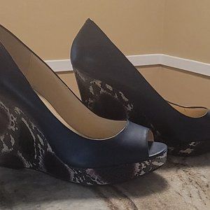 Blue leather platform styled with snakeskin 4 inch wedge heel. Shoes have never been worn.