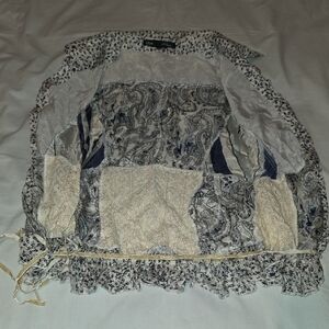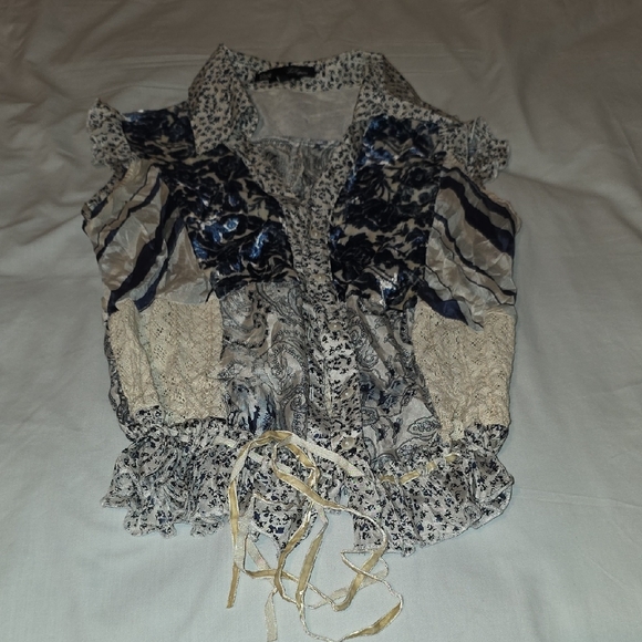 Stylish blouse with ruffle details. Features a mix of blue, cream, and black patterns. Ideal for a chic look. Velour blouse size 44 fits Medium and large.