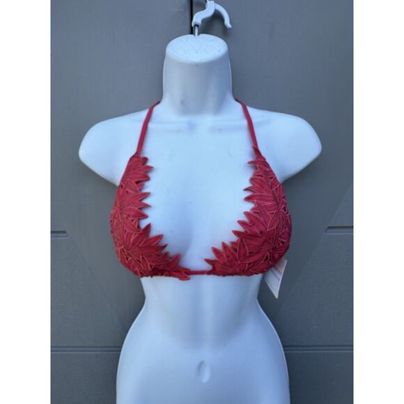 This sultry show stopper triangle top features triangle cups with red lace overlay ties at the neck and the back.