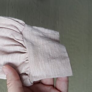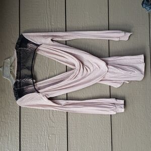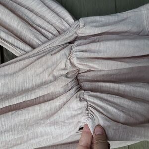 Super cute nude tan top with open back and surplice front. Lace detail in the back. Elastic waist and cuffs with asymmetric peplum hem. Soft lightweight material. Made in the USA. Never worn, like new condition. No tags attached. Brand tag is pinned on with same material fabric, it came this way brand new.