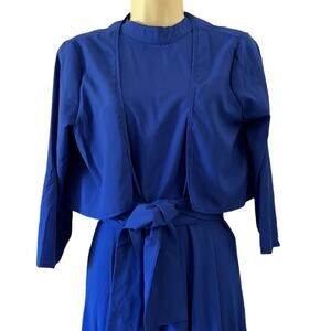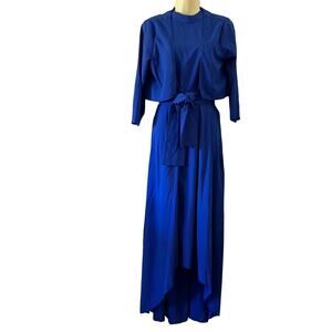 Blue lightweight polyester maxi dress with high low asymmetrical hemline, sleeveless with cutaway armholes, pleated skirt, back zipper, matching bolero jacket with 3/4 sleeves and tie belt