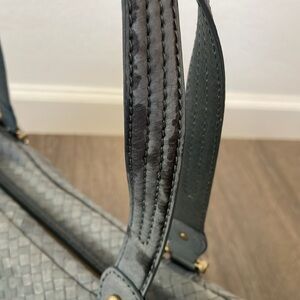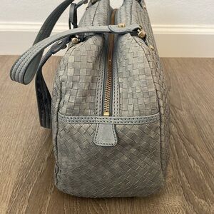 Leather. One of the should straps has some discoloration on it. Also a small spot of discoloration on the bottom of the bag.
