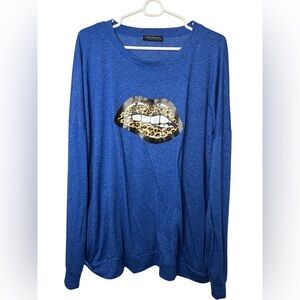 Blue Long Sleeve Top with Leopard Print Lips NWOT. Pockets. Size XXL.