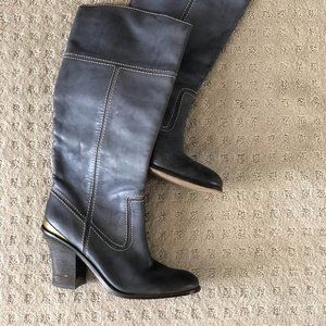 Blue Lucky boots fun for jeans and for dresses, schnazzy gold accents on the heel and white stitching.