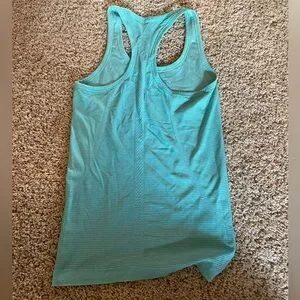 This is a blue Lululemon racerback tank top. It is a size 4. It is gently worn and has no holes, stains, or rips.