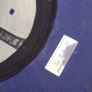 Set of blue baseball caps featuring team logos. Perfect for sports fans.