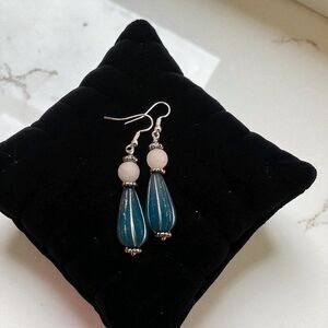 Blue Melon Teardrop & White Jade Earrings Czech Glass 925 Sterling Silver