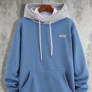 Blue Casual Mens Letter Embroidery Colorblock Drawstring Hoodie