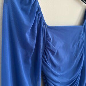 Blue Mesh Long Sleeve Square Neck Ruched Bodycon Mini Dress, Size XS
