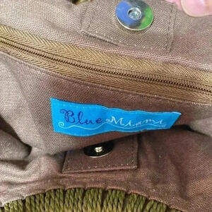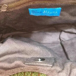 Brown cotton lining - with green raffia macrame. Wood O ring handle with buttons details - magnetic snap close. approximate measurements: 15” wide & 15 1/2” long with a 7” handle drop. Color: dark brown with buttons. Preowned good like new used condition please check all pictures.