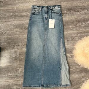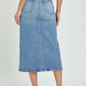 This blue midi pencil skirt is perfect for both casual and work settings, featuring a stylish slit for added flair. Its sleek design offers a modern touch to a classic silhouette, making it a versatile addition to any wardrobe.
