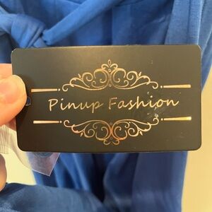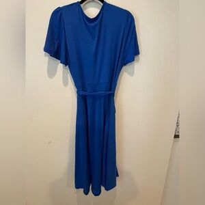 This blue midi sundress features a flattering wrap design with a tie front and a cowl neckline. The flutter sleeves add a touch of elegance, making it perfect for casual or work settings.