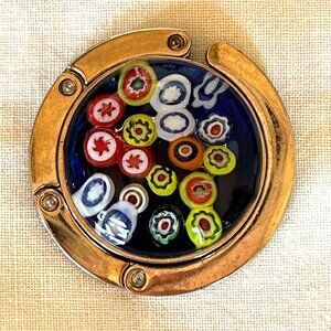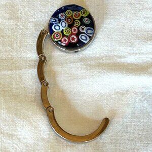 Blue Millefiori glass purse hook combines functionality with art with a multi color floral design. Crafted for elegance, it ensures your purse remains clean and safe in style.