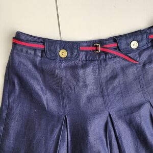 Stylish navy blue skirt. Features red accents and gold buttons. Perfect for any occasion.