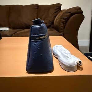 This elegant blue handbag is perfect for any occasion. Its sleek design and high-quality material make it a must-have accessory. Comes with crossbody strap, never worn.