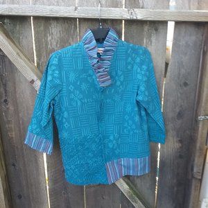 Lightweight jacket/shacket/structured button front shirt. Mixed patterns and textures pieced together: geometric line print, flowers, textured raw edge, and multicolored striped trim culminating in a sculptural ruffled neckline and collar. Functional buttons down front. Lined. GVC. Anthropologie vibes.