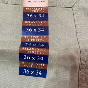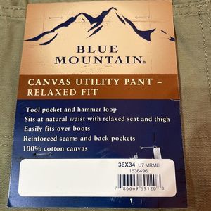 Blue Mountain Men's Relaxed Fit Khaki Tan Canvas Utility Pants Size 36 x 34 New with Tags Tool pocket and hammer loop Sits at natural waist with relaxed seat and thigh Easily fits over boots Reinforced seams and back pockets Five pocket design Belt loops Waist: 19" Inseam: 33.5" 100% Cotton canvas I have multiples of this size. Bundle for discounted shipping.