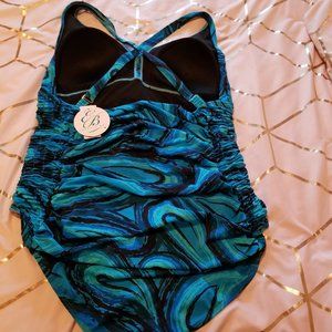 Beautiful Blue Multi Color Halter One Piece Bathing Suit with sheering on the sides. Never worn.