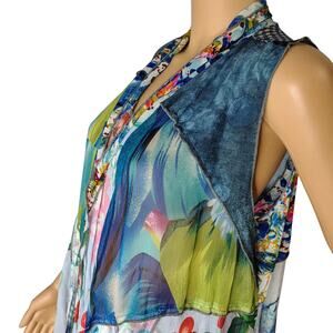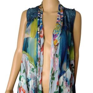 Blue Multi-color Floral Print Sheer Patchwork Open Front Long Flowy Vest Size M