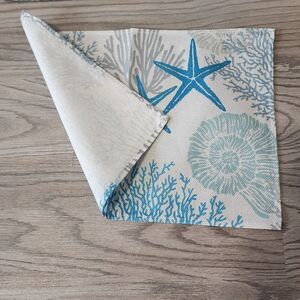 Add a touch of the ocean and summer vibes to your dining table with this set of four blue coastal placemats. The rectangular shape and size of approximately 12" X 17-1/2" make them multipurpose and perfect for any occasion. The placemats feature a nautical pattern with starfish, seashells, and coral, making them a great addition to any beach-themed decor.