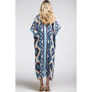 Blue Navy Multi Long Open Front Aztec Tribal Pattern Kimono Wrap Coverup Top