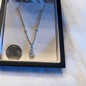 Preowned Blue Nile Emerald Halo and Station Diamond Necklace in 14K white gold. A copy of the appraisal from Blue Nile will be included.