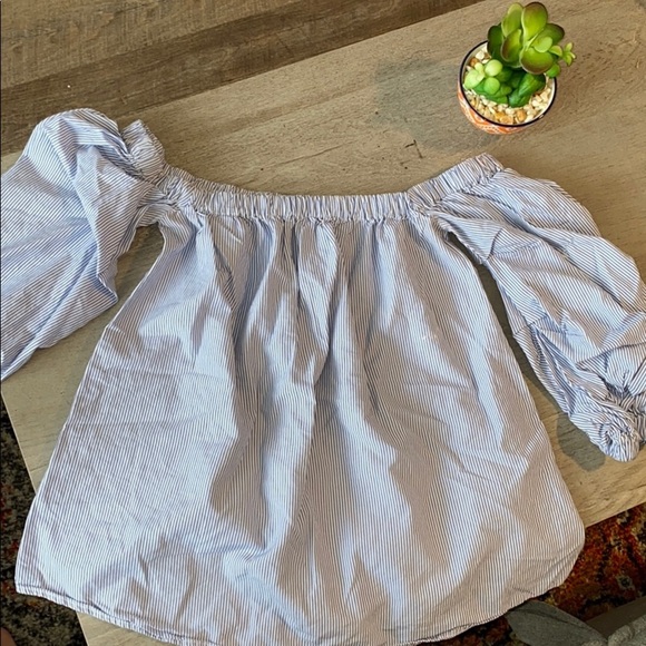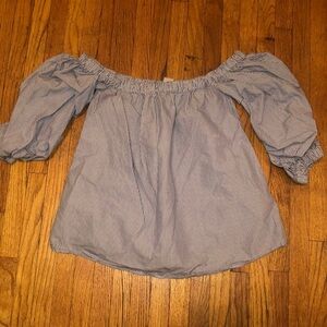 Off the shoulder with elastic chest and sleeves. Sleeves are a bit loose and ruffled.