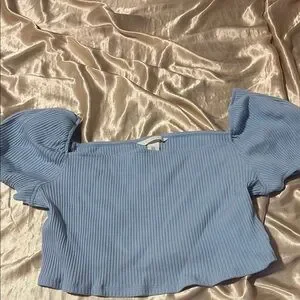 Elevate your style with this chic blue off-shoulder ribbed top. Perfect for any occasion, this top offers a flattering fit and trendy design.