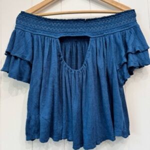 Stylish blue off-shoulder top with ruffle details. Perfect for casual outings.