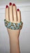 Gorgeous 5-strand beaded bracelet with turquoise/aqua blue faceted beads, along with translucent gradient beads of same color with olive green tones in an opal-like appearance, which have an AB coating. White crystal spacers linked in between a floral pattern are the focal point for the center row.