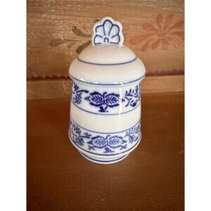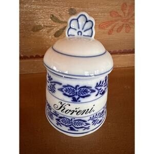 Vintage Blue Onion design ceramic lidded jar. Excellent condition. "Koreni" (Slovak) is written in black italic script meaning allspice. The jar is an Eastern European item.