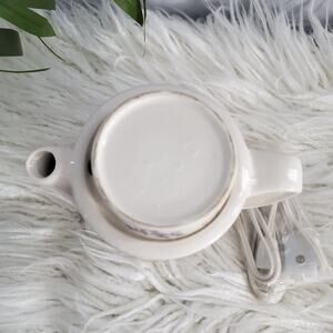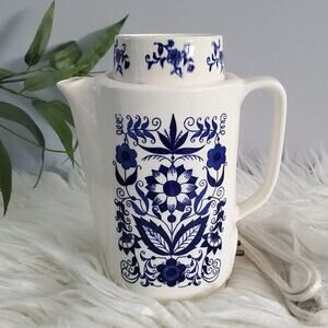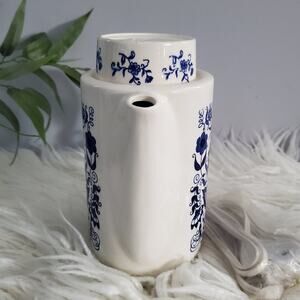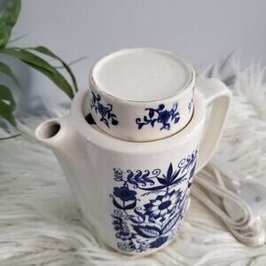 Vintage blue onion electric teapot with lid. The electrical component inside this teapot is damaged, however, this piece is still beautiful for its right new home. It comes from a pet and smoke-free environment.