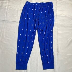 Comfortable blue pajama pants with white logo pattern. Perfect for lounging. Has pockets, and drawstring.