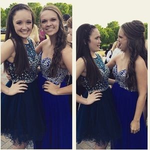 This dress has been very loved. Many friends of mine have asked to borrow it because they loved it so much. It was worn to 2 proms, in 2 homecoming parades, in 2 pageants, and to the Shuler Awards. There is little trace of wear and tear along the bottom of the gown, and a few beads had to be sewn back into place. the back is a corset. Negotiable price!