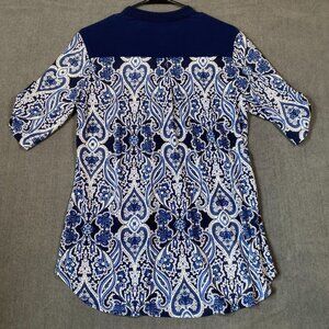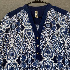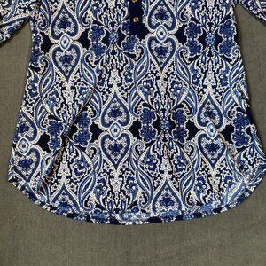 Blue Paisley V-Neck Tunic With 3/4 Sleeves PerSeption Concept Button Womens L
