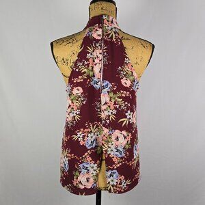 Blue Pan halter neck top with a single front pleat for graceful drape. Burgundy with floral print in pink, blue, green, and ivory. Sleeveless with back zip closure. Made in USA. Lightweight stretch fabric. Y2K inspired vibe perfect for date night, casual wear, or retro-chic looks. Excellent pre-owned condition.