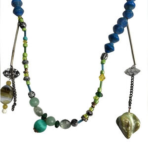 Blue Paper Beads assemblage Drop Bar Chain Rose Beads Necklace