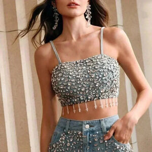 Blue Party Women's Fashion Luxury Beaded Denim Camisole Top