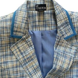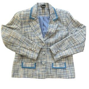 Womens tweed jacket Size Large Shades of blue and cream Super cute, reminiscent of 90s Chanel. Silk lined. Three button closure.