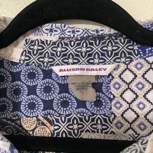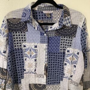 Allison Daley Artsy Boho Chic Casual All Season Aesthetic 100% Cotton Blue Graphic Button Down Top