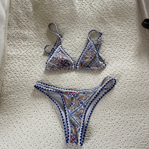 Stylish blue patterned bikini set perfect for summer. Features a vibrant design for a standout look at the beach or pool.