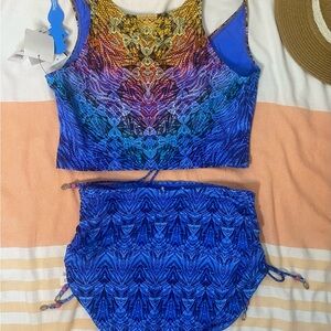 Dive into style with this vibrant blue patterned bikini set. Perfect for a day at the beach or pool.