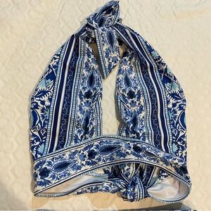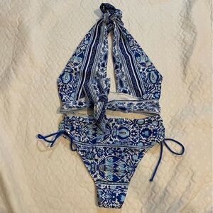 Stylish blue patterned bikini set. Features a halter top and tie-side bottoms.