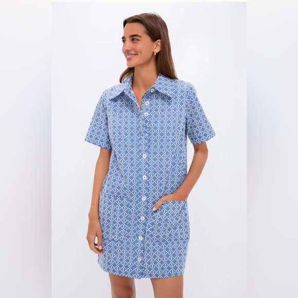 Tuckernuck dress- Embroidered Denim - Stylish blue dress with a geometric pattern. Features a button-up front and short sleeves. New- Never Worn