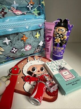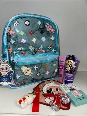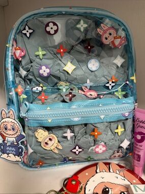 Clear mini backpack with blue trim. Multicolored monogram-style stars and cute character prints. Front zip pocket and top handle. Comes with lip gloss, keychains and lotion