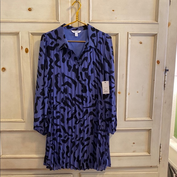 Stylish blue dress with a bold pattern, perfect for any occasion. Approx 35 1/2 inches from mid shoulder to hem.